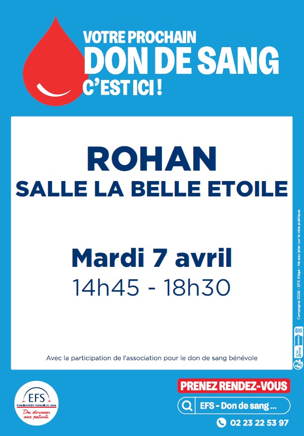 ROHAN – SALLE DES FETES  LA BELLE ETOILE MARDI 7 AVRIL 14H45-18H30 LIEN DU PLANNING EN LIGNE    Avant d’aller sur place, prenez rendez-vous, même à la dernière minute : dondesang.efs.sante.fr, l’appli don de sang ou au 02 23 22 53 97. Vous y retrouverez aussi un quizz en ligne pour savoir si vous pouvez donner.